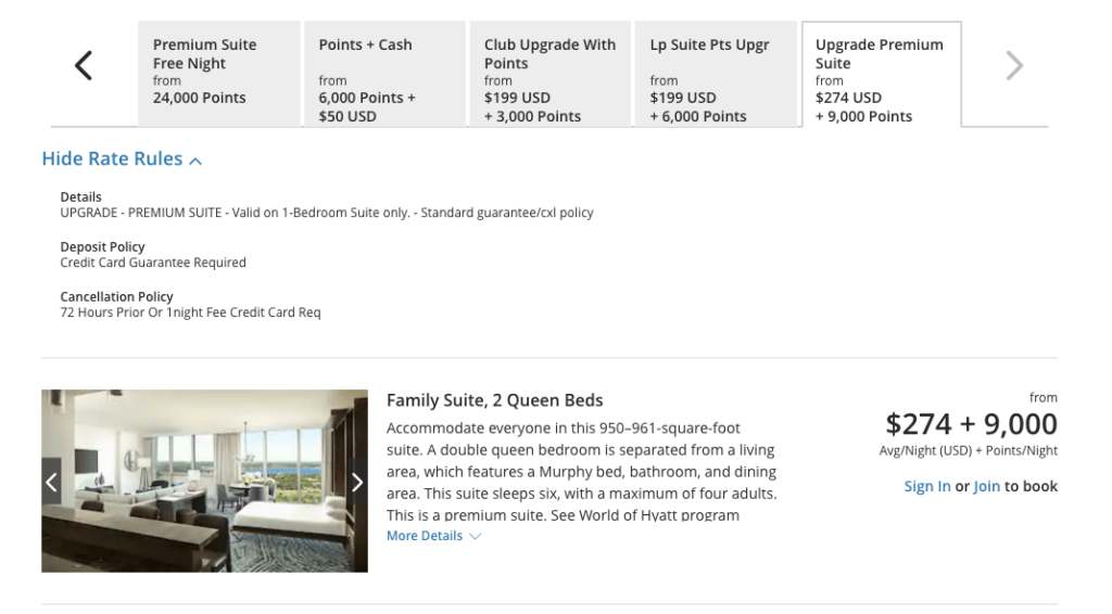 Using Hyatt points to upgrade from a base room to a suite is arguably one of the highest value redemptions you can make. Often times the price differential is 100s of dollars, but it only costs 6k points to upgrade a standard room to a standard suite and 9k points to a premium suite. While it’s been something that I’ve done frequently in the past, I wasn’t aware that the option is now available online, at the time of booking. This is an amazing perk – have I missed this at some point?