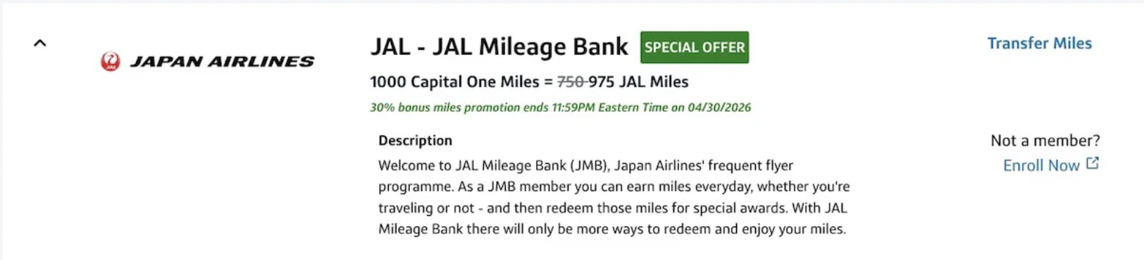 We have a limited time 30% transfer bonus to JAL, normally 4:3, which makes the ratio 1000:975 or nearly 1:1. That is particularly appealing on JAL flights in business class from the US to Asia. We just saw this bonus in Feb…it’s back for April.