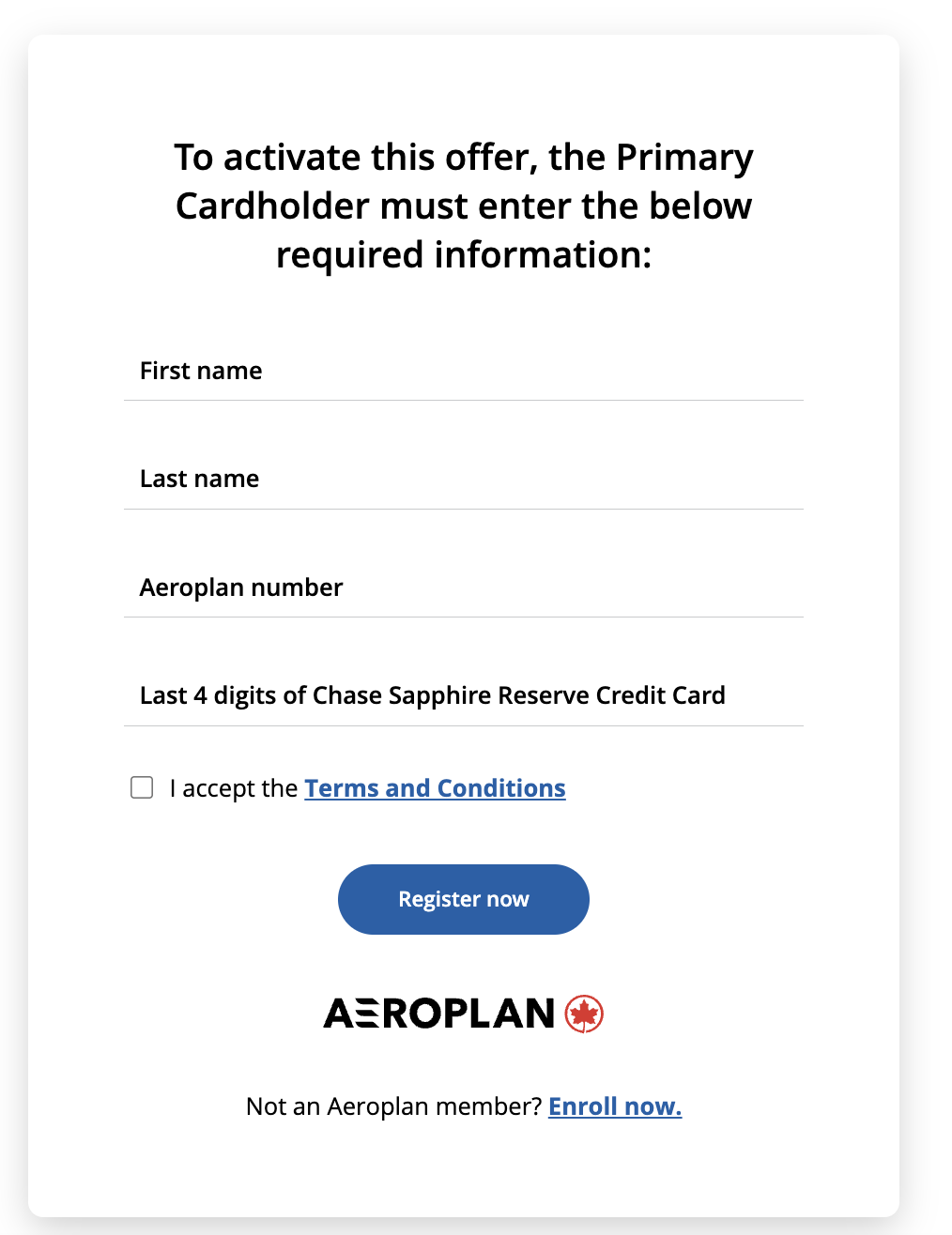 ‡ To be eligible for this offer your Chase Sapphire Reserve Credit Card account must be open and not in default and your Aeroplan account must be in good standing at the time of registration and fulfillment. Only members who register between August 5th at 12:01:01 AM EST and 23:59:59 PM EST on August 18th are considered eligible for this offer. Register for the offer by entering your First Name, Last Name, Aeroplan Number, and the last 4 digits of your Chase Sapphire Reserve credit card and click “Register Now”. The offer is only available to the primary cardmember of the Chase Sapphire Reserve Credit Card account and only one 5,000-point flight reward certificate can be earned per Chase Sapphire Reserve Credit Card account. The First Name and Last Name of your Aeroplan account must match the First Name and Last Name of your Chase Sapphire Reserve Credit Card account. Flight reward certificates have no cash value and cannot be exchanged or refunded. For the purposes of this offer, the expiry date of the Flight reward certificate is 365 days after the day that the flight reward certificate is deposited into your Aeroplan account. The flight reward certificate can take up to 14 days to be deposited into your Aeroplan account from the time of registration. For the purposes of this offer, only one Flight Reward Certificate can be earned per Aeroplan account. Chase is not responsible for the provision of, or failure to provide, the stated offer.