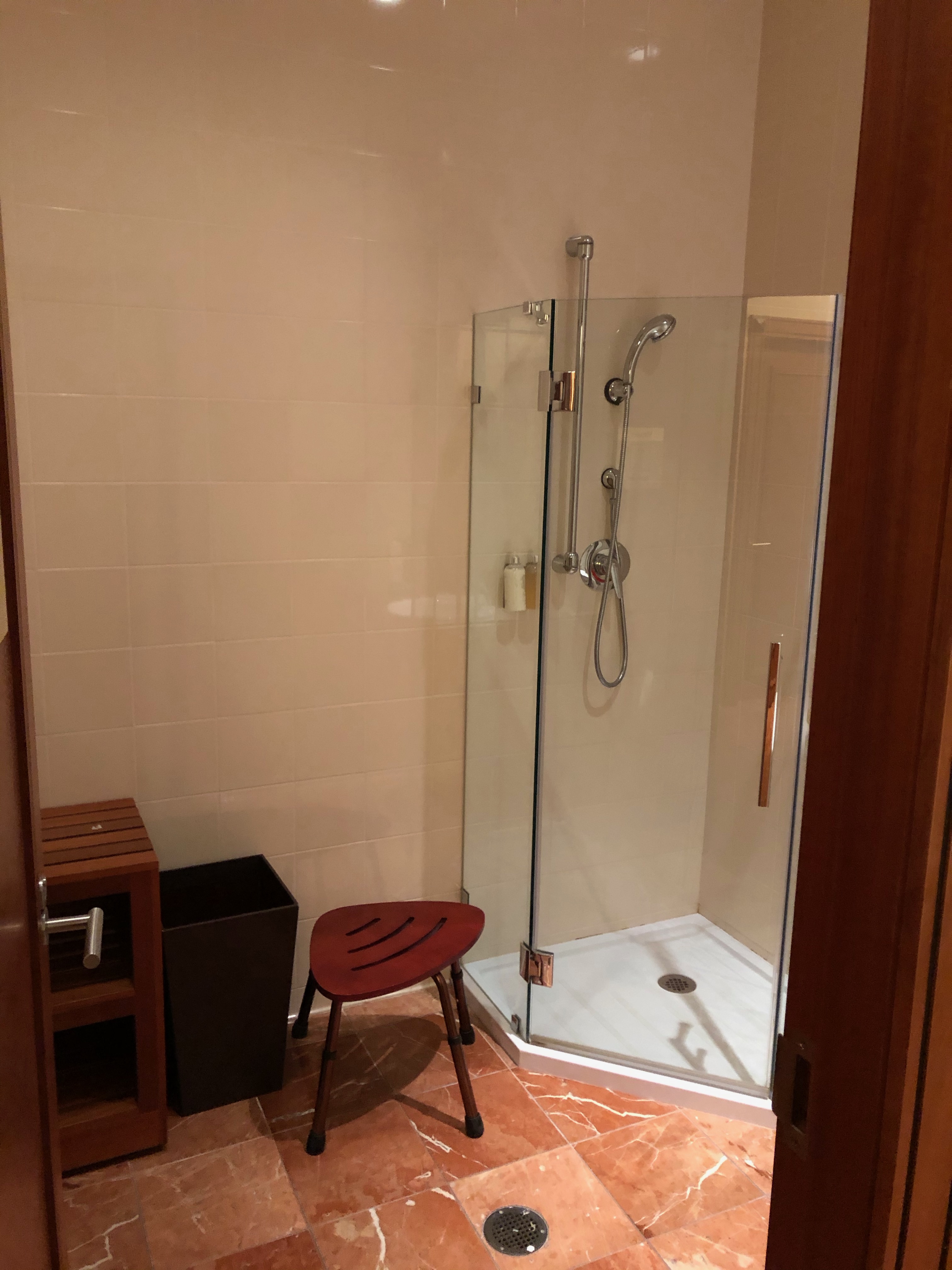 The shower itself is huge and includes a sit down area. You will only get 5 minutes worth of water, and when you have 30 seconds left, it will start to pulse. I would highly recommend turning the water on and off as you soap and suds to maximize that time you are aloted. It’s truly a bucket list experience that I hope you all get to try.