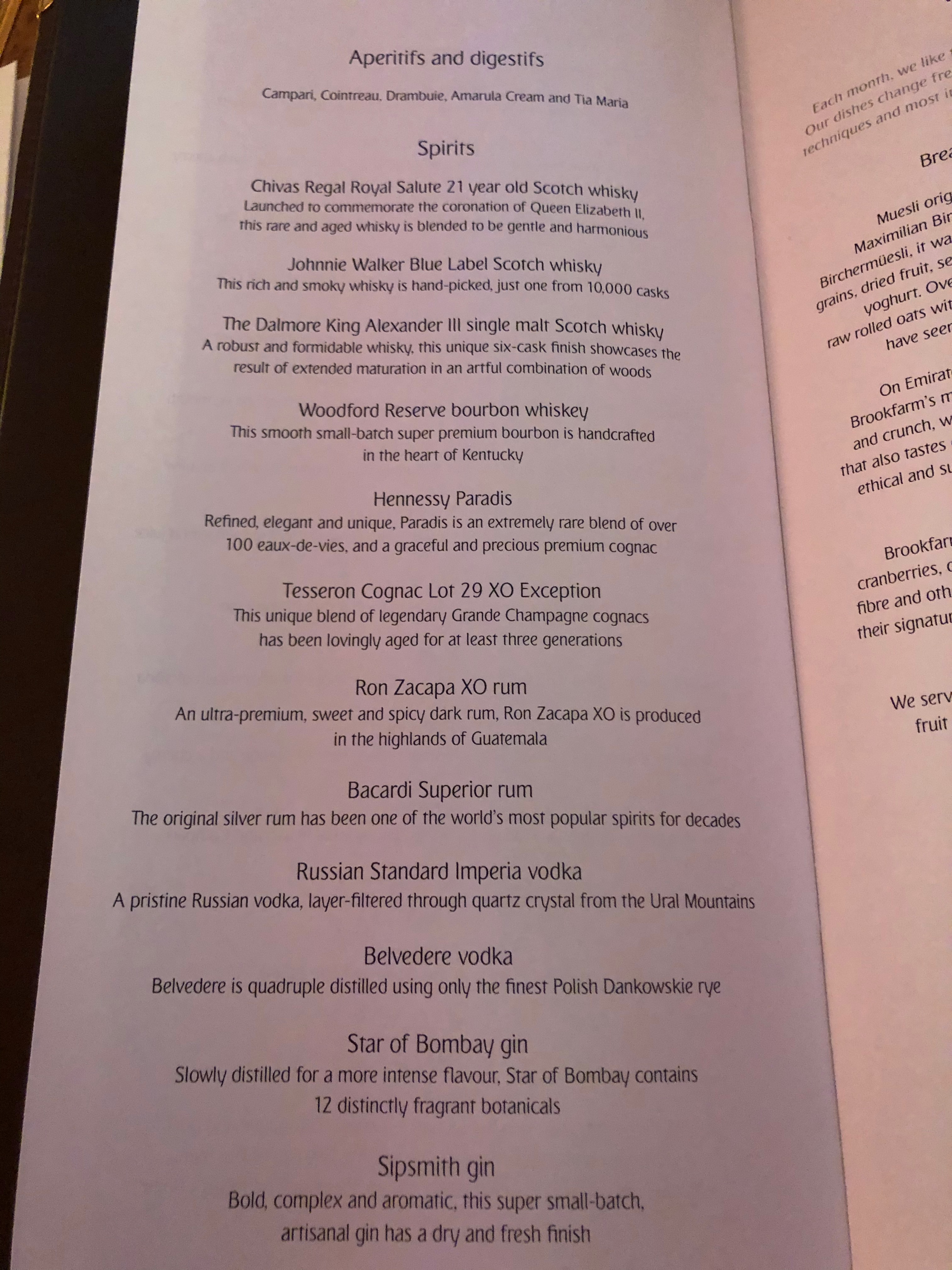 Emirates is famous for offering some of the best wine in the sky. In fact, they keep a cellar in Burgundy, France with over 1.2 million bottles and have invested hundreds of millions of dollars just in wine. As you can see in my video review, they also offer some really expensive spirits: Cognac ( Hennessy Paradis ), Johnny Blue, amongst others. That Hennessy retails for $1000!
