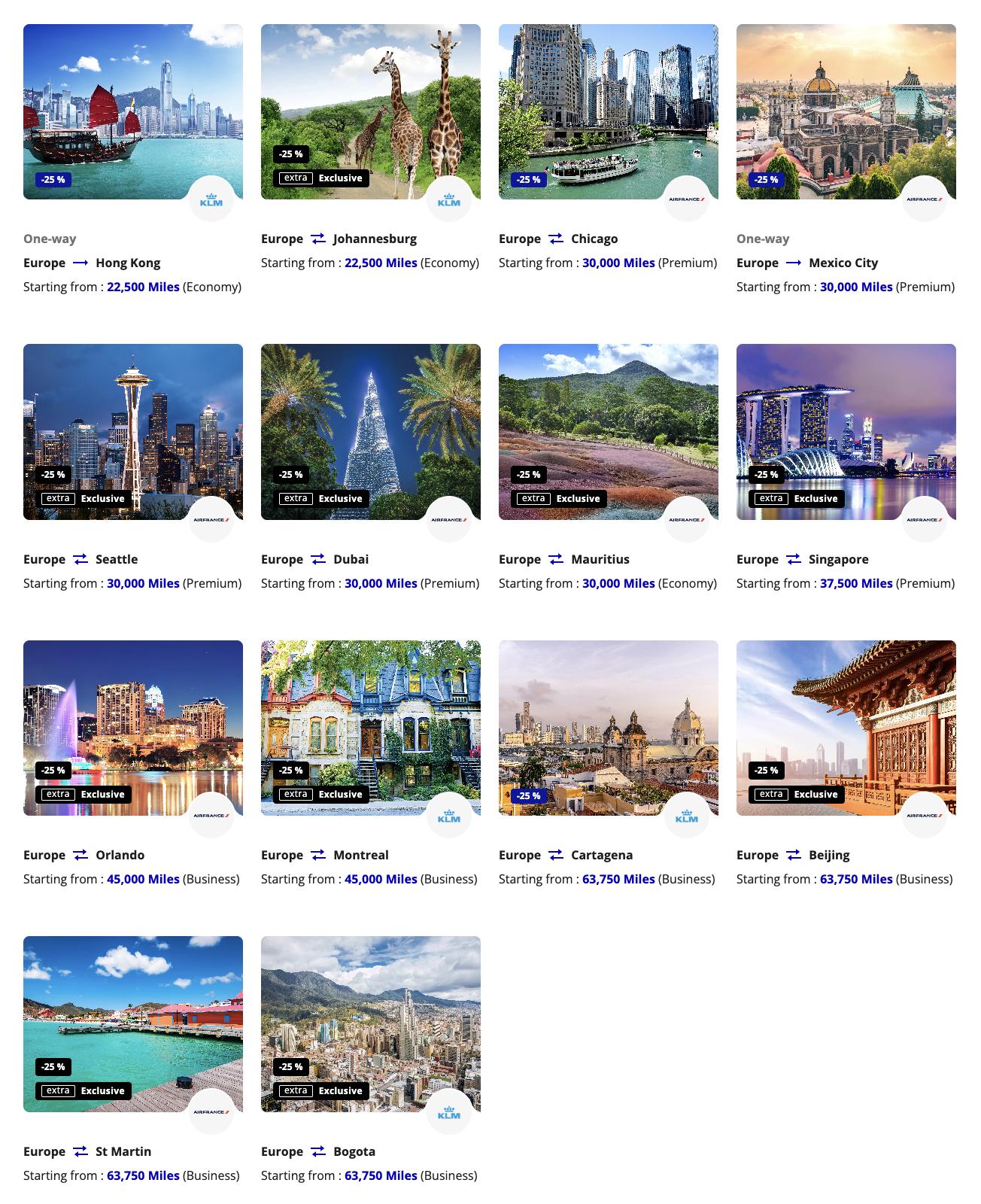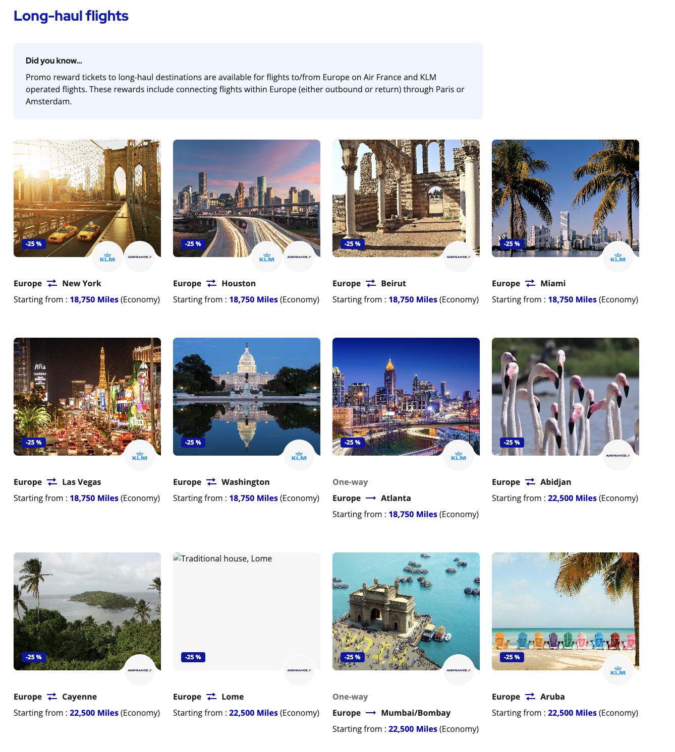 - Displayed Miles Fares for Long Haul destinations are for flights to/from Paris or Amsterdam.
