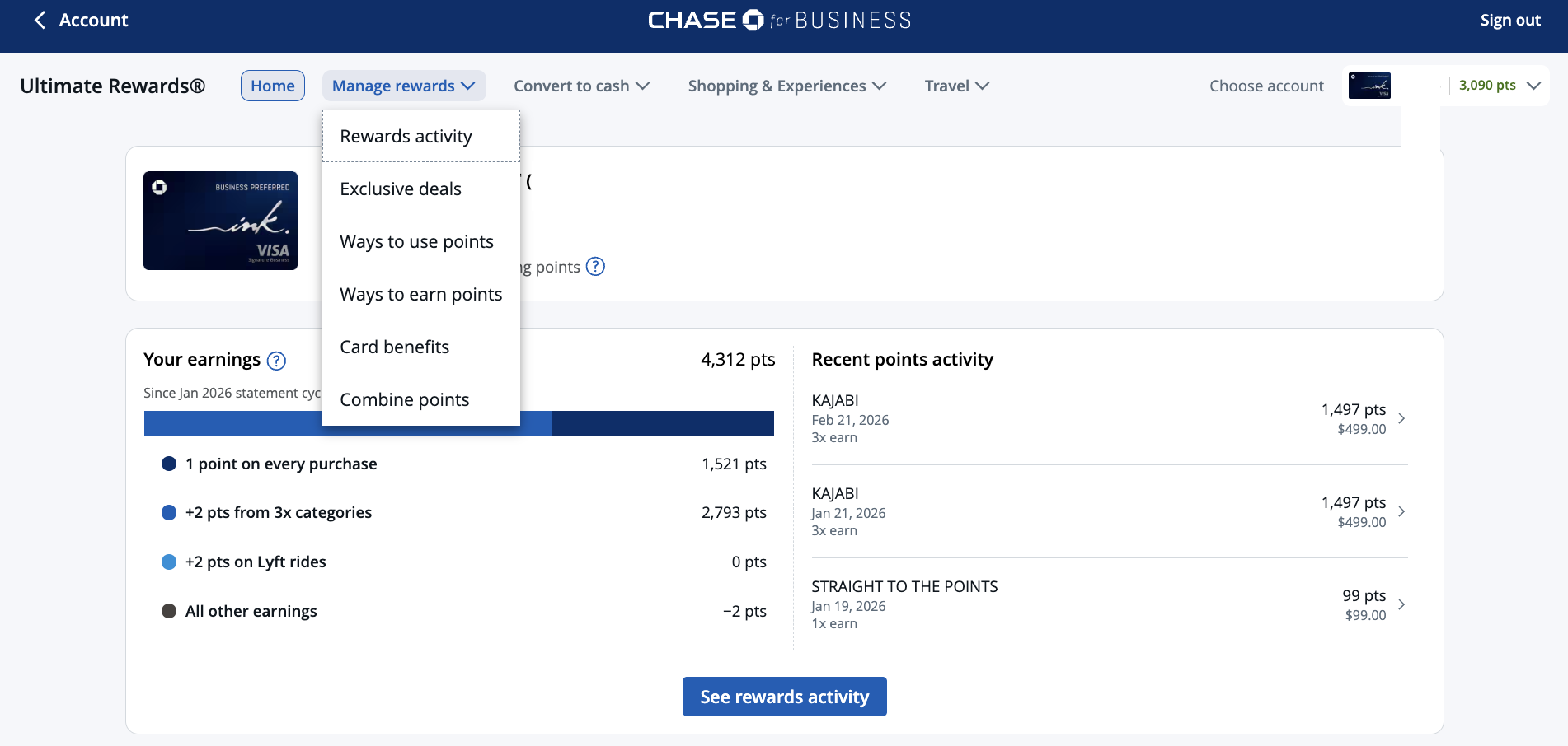 Once you’re inside your Ultimate Rewards account, you’ll see the following screen. Click the Manage Rewards drop down menu.