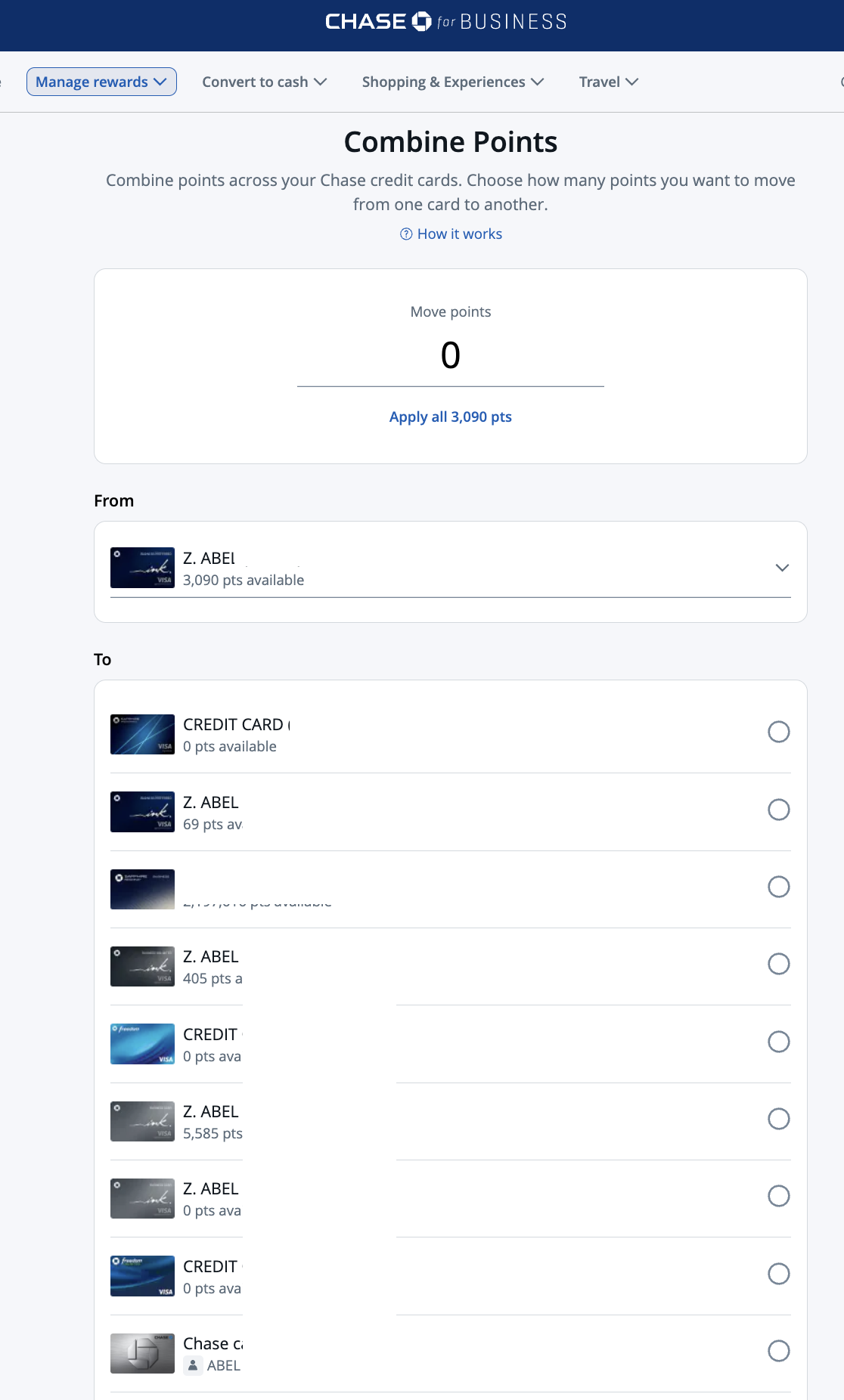 I thought it’d be advantageous to show you how you can move points between accounts…it’s the same whether you move from a Chase Freedom Flex® or Chase Freedom Unlimited® to a Chase Sapphire Preferred®,  or Chase Sapphire Reserve® as it is from an Chase Ink Business Unlimited®  Chase Ink Business Cash®  or Chase Sapphire Reserve for Business(SM) to a Chase Ink Business Preferred® as I show down below.