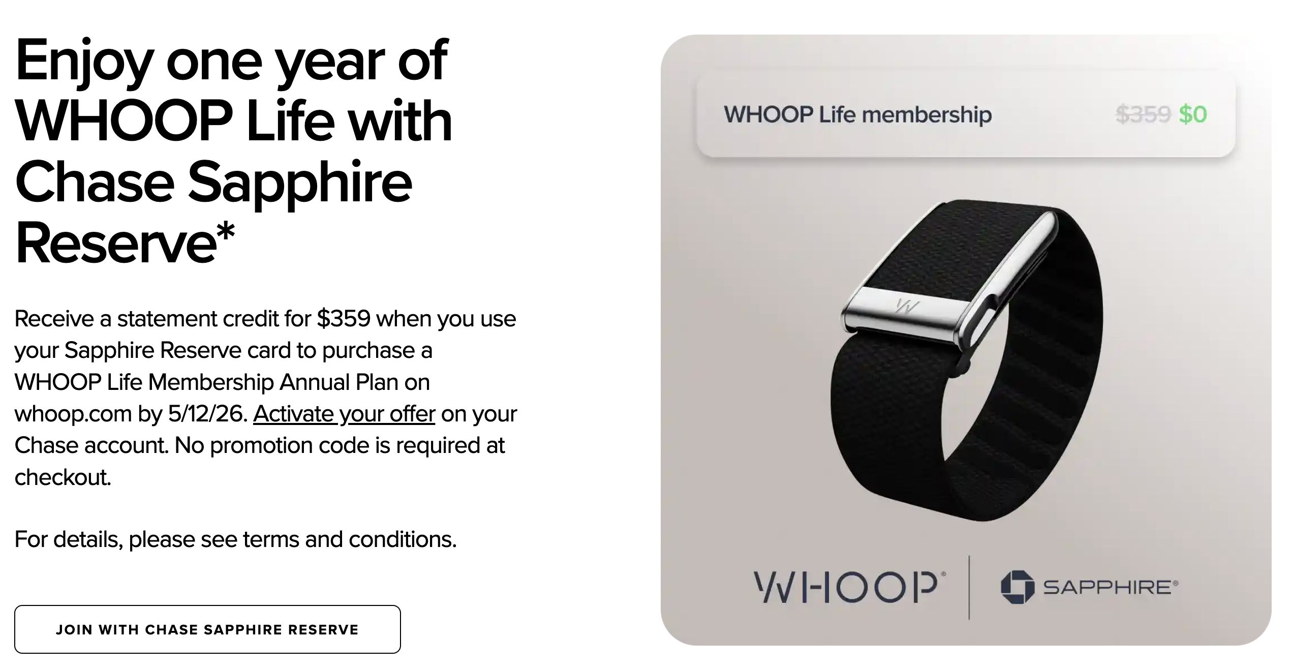 - Cardmembers must activate the offer through Chase Offers before purchase. Eligible purchases include WHOOP memberships. The offer can be redeemed once per eligible cardmember through May 12, 2026. For more information on the Chase Sapphire WHOOP offer, visit whoop.com/chase-sapphire.