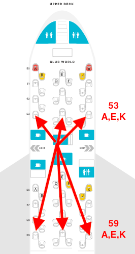 As you can see, downstairs the cabins layout is 2-4-2. This means that those middle seats are VERY close together. If you’re together, that’s great – in fact, there are some that not only offer the combined space, but also aisle access. See the diagram above. If not…you may have an unwanted cuddle mate with some bad turbulence.