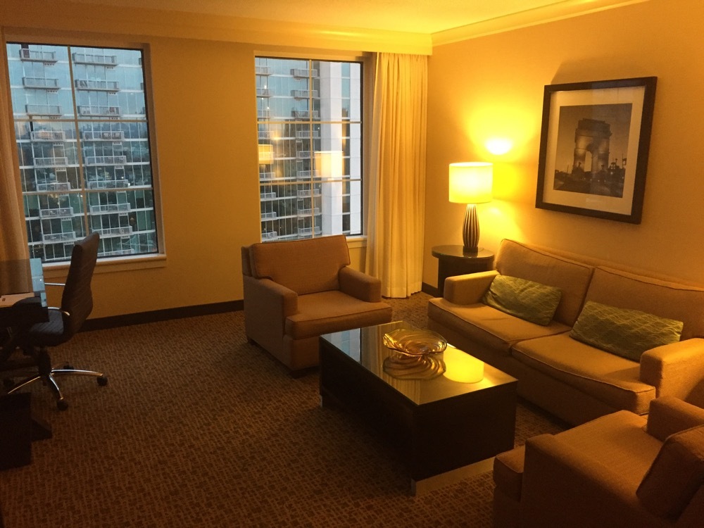 Very nice. Roughly 700 sq ft and has a pull out couch in the living room. Since 3 of us would be in the room, the space came in very handy, as did the pull out couch. I also need to sleep with some sort of white noise which can annoying…I took the living room while the other two dudes took the bedroom. I think, if you’re traveling with more than 2 people in a room, a Suite is clutch. If you can’t get a good deal, try and get the hotel to guarantee connecting rooms.