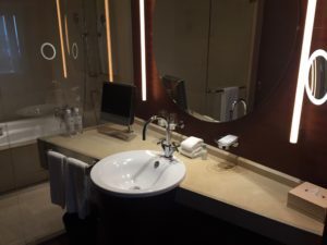 The room is roughly 450 sq ft and features every modern amenity. Amenity kits, incredible toto toilet ( a personal fave), to complete blackout remote controlled curtains.