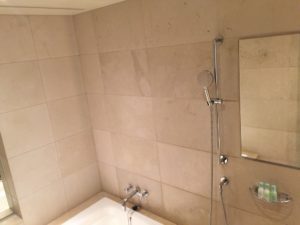The bathroom was kitted out as well. I love the shower/tub enclosure.