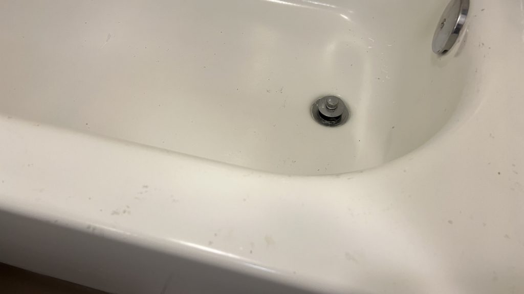 Single vanity and a tub that had weird chips taken out of it. The shower curtain was dirty, but the room overall felt clean enough.
