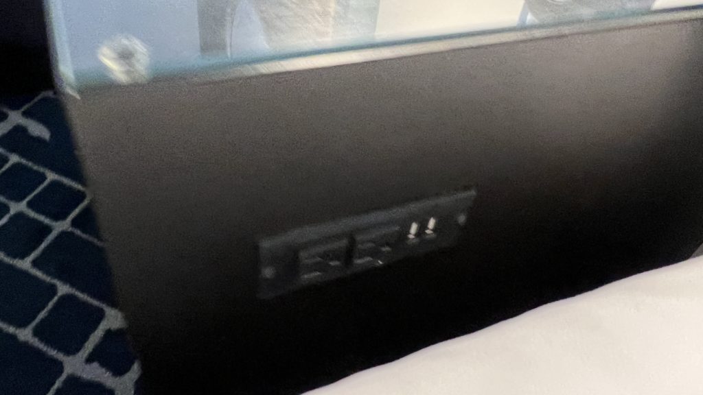 One nice thing was each side of the bedside table, which had our free water, had plugs on it for charging, etc.