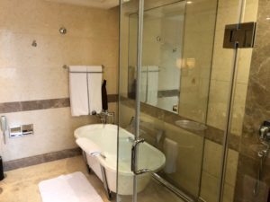 The hotel lobby is massive. Marble. Chandeliers. Atrium. It has an old school luxury feel. We checked in via the Ambassador lane and were given an explanation of benefits, as well as an upgrade to a deluxe room. There are club rooms available, but seeing as though we were there for just a night and were planning on being out on the town as well as leaving prior to breakfast…we didn’t think it worth the upgrade price. Roughly $60