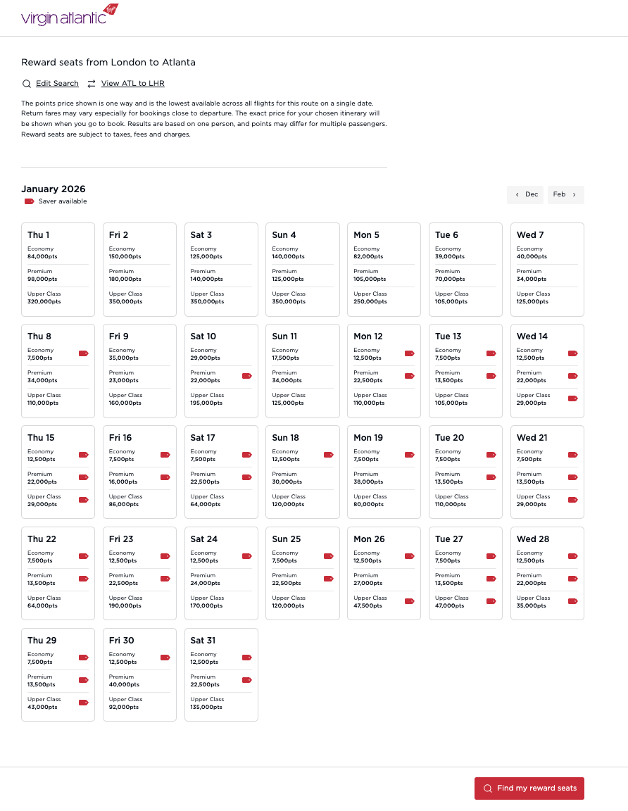 Watch out for those taxes and fees…but Virgin Atlantic releases a lot of award space on their own flights. Like..a lot. With rates starting around 47,500 miles for a one way upper class flight, it may be worth paying $600+ in taxes and fees to fly Upper.
