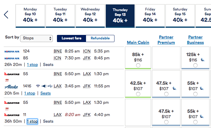 It was just announced that Qantas would be flying their gorgeous, new 787-9 Dreamliner from Brisbane to Los Angeles starting September 1st, 2018. That flight will also continue on to New York which creates great bonus flight opportunities utilizing Alaska miles. Just for giggles I searched for possible availability on the inaugural flight from Brisbane to LA on the 1st. Sadly, no business class seats were available, but there were premium economy seats. What’s even better, if you utilize Alaska’s stopover benefit, you can fly from LAX to JFK in their amazing business class at a later date. Check it out.